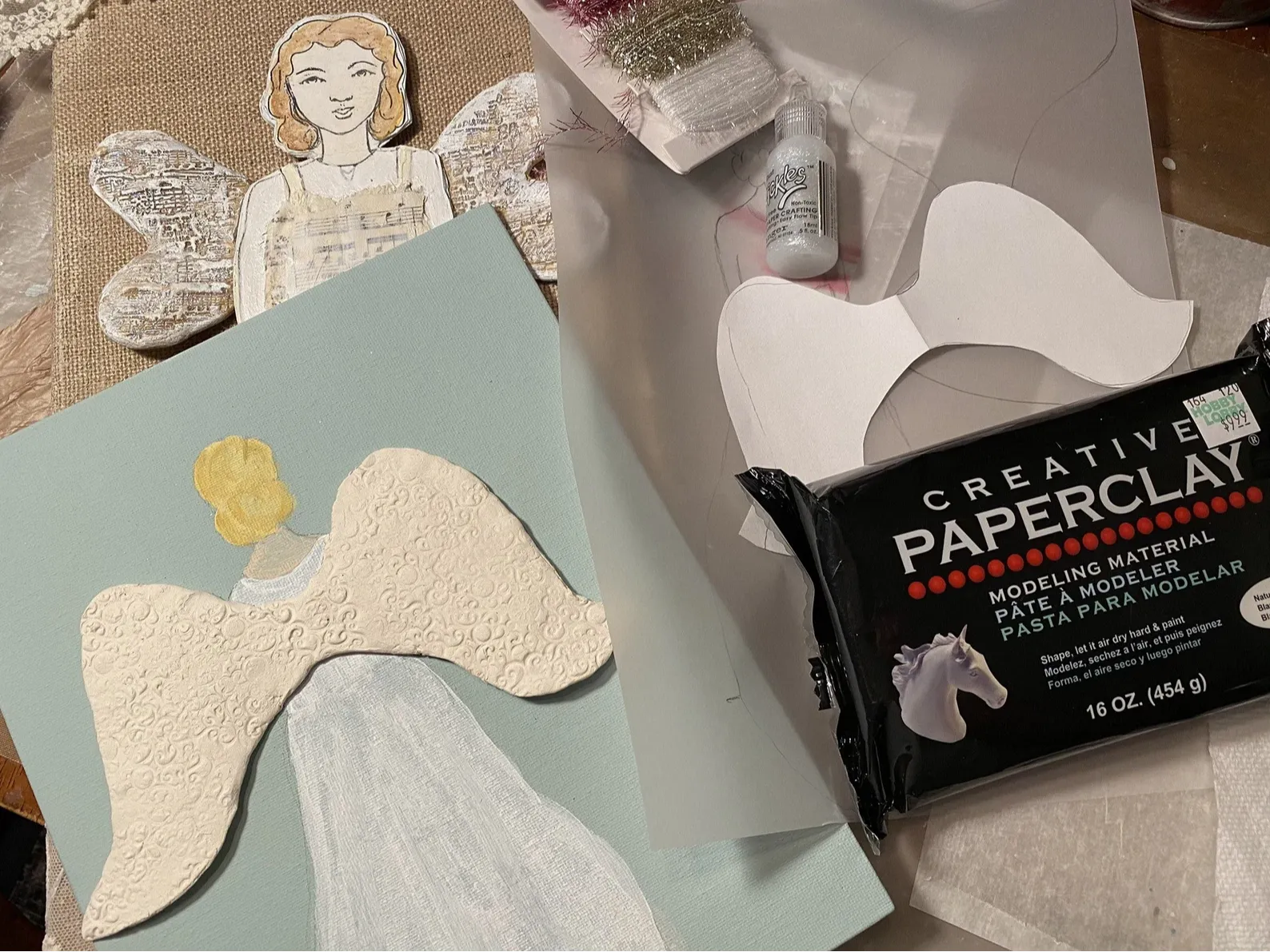Jeanie is giving you access to her Mixed Media Angels Among Us class where you play with cardboard, paper clay, paint and fabric.